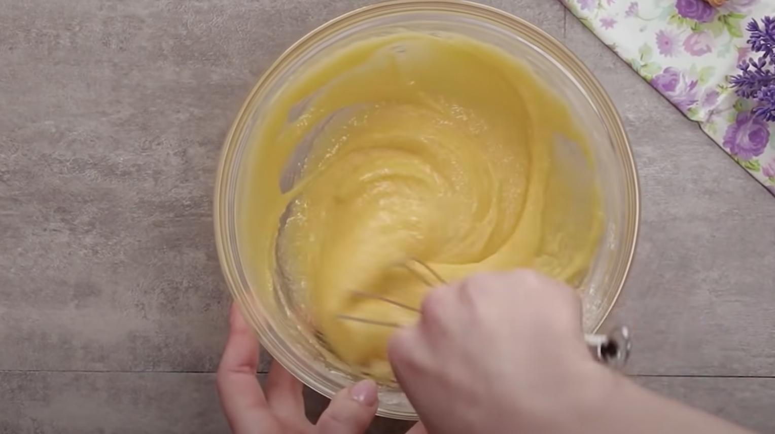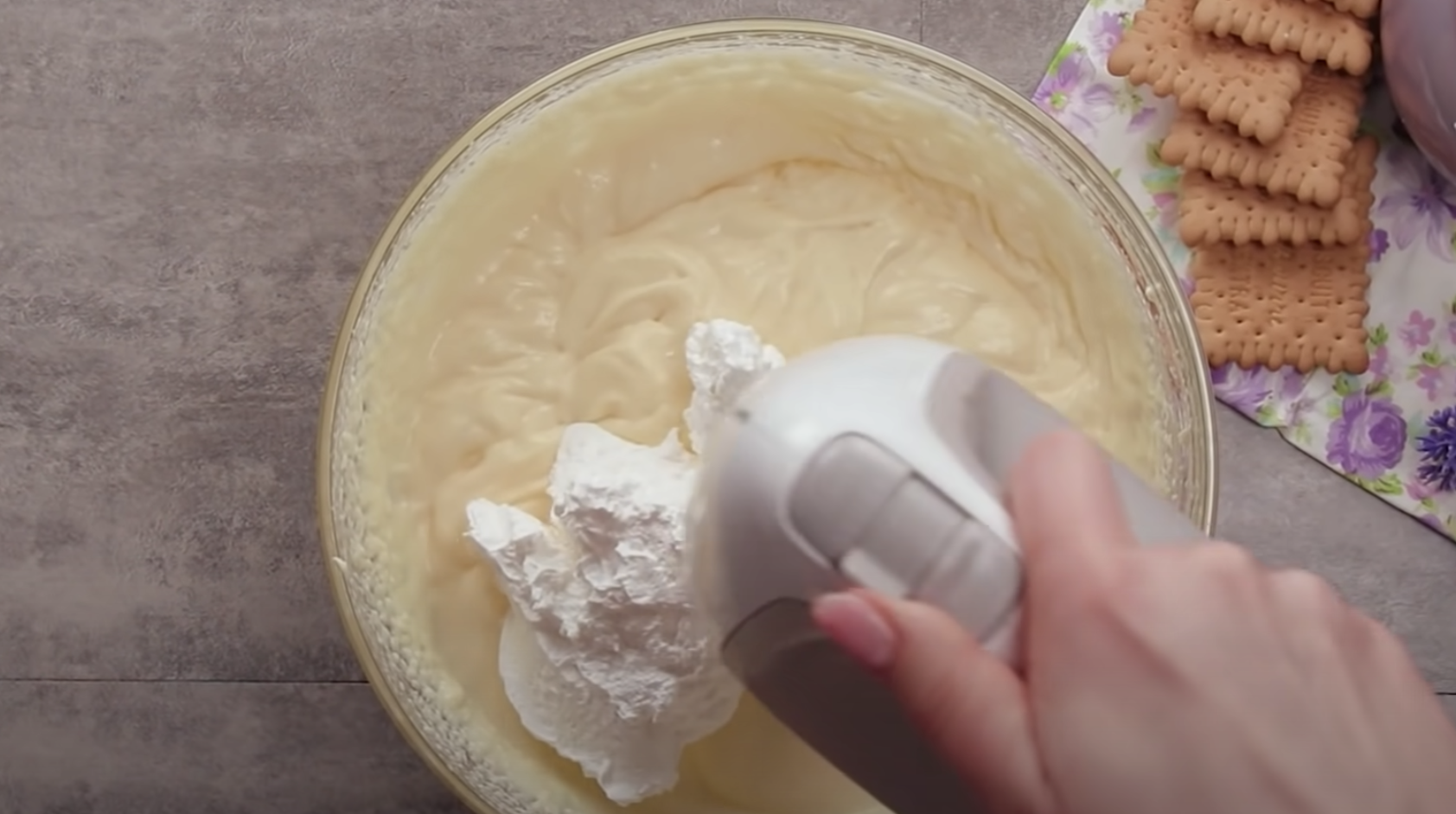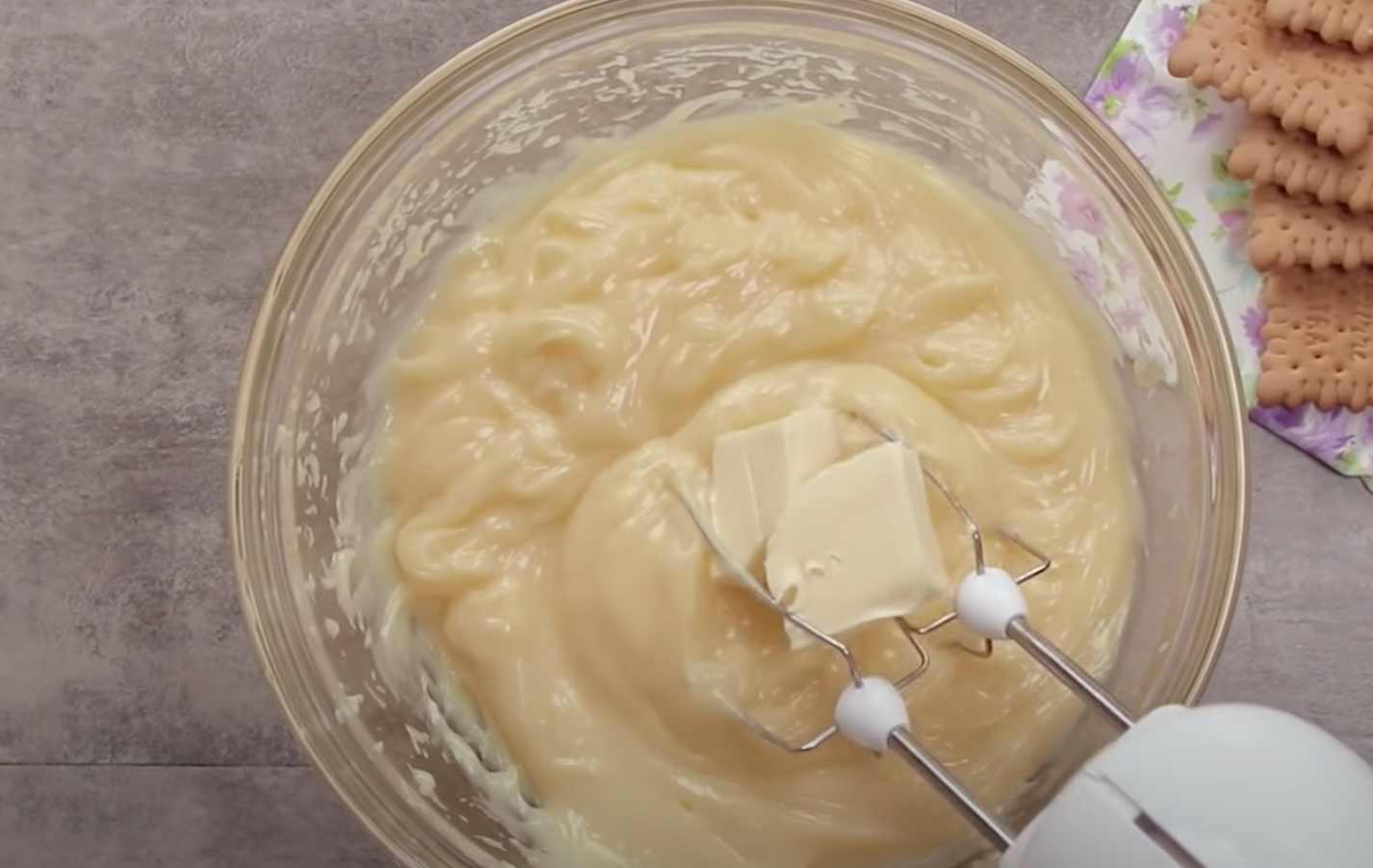 Zdejmij z ognia i pozostaw do ostygnięcia pod folią. Następnie dodaj do niego i ubij zarówno miękkie masło, jak i ubitą wcześniej śmietanę.