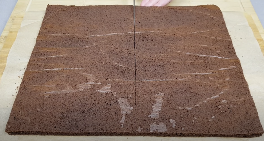 Kiedy ciasto jest upieczone, wyciągnij je z piekarnika i ostudź. Delikatnie odwróć formę i zdejmij papier. Wyrównaj krawędzie za pomocą noża, a następnie pokrój ciasto na cztery równe części.